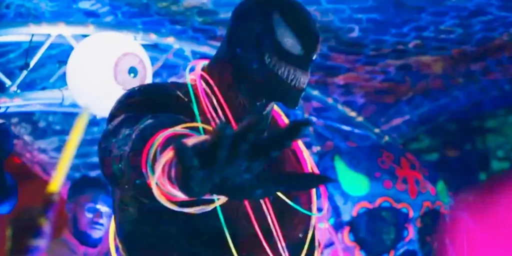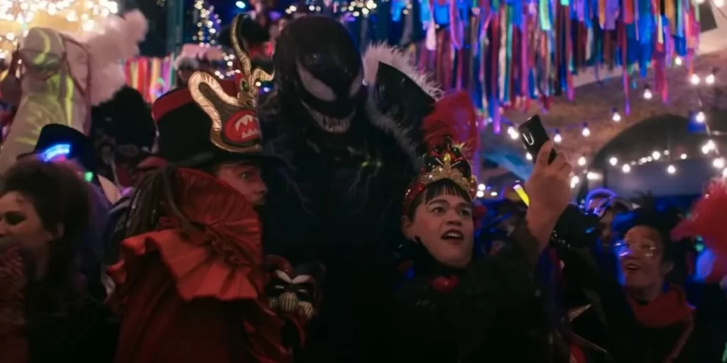 Eu não iria tão longe ao chamar isso de subtexto gay porque é tão EXPLICITAMENTE na sua cara que subtexto não é o foco desse filme, embora os tenha. Com Venom dizendo algo do tipo: “Estou fora do armário de Eddie!” e fazendo um discurso inteiro sobre amor e respeito igual para todos os seres, dentro de uma rave cheia de esquisitos fantasiados, no que deveria ser uma das cenas mais ridiculamente trash do filme, é na verdade dramaticamente adorável!