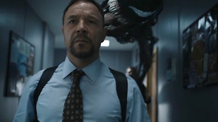 Em alguns dos raros momentos do primeiro filme, o roteiro apresentava a idéia de explorar a depressão que recai sobre Eddie Brock, tal como nos quadrinhos antes de ele encontrar o simbionte por meio de um desencontro com o Homem-Aranha. E Hardy, com o pouco que tinha ali, conseguiu construir um indivíduo muito simpático que você facilmente sentia por ele, mesmo com a superficialidade do material. O que tornou a chegada do simbionte em sua vida um verdadeiro sopro de alívio para tirá-lo da miséria, solidão e do fracasso em que ele estava se enterrando.